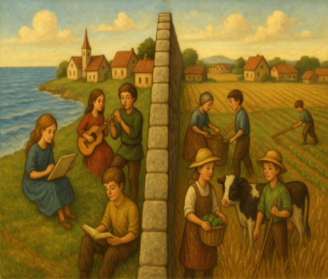 The story is set in a village divided by a high wall. On one side, live the farmers (the Brown-eyed people); on the other, the artists (the Blue-eyed people). Fueled by the propaganda of their elders, the two sides live in mutual distrust. However, when two kids—Sky and Clay— who don’t fit in, strike up an unlikely friendship, they must find an ingenious way to tear down the walls of prejudice and bring their community together.